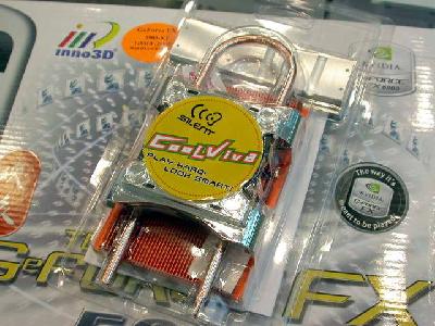 “宝贵”的Inno3D FX5900XT限量版乍看上去好像缺了点什么。与别的显卡相比他的风扇被拿掉了,赤裸的显示芯片暴露在外。本以为它不用散热器呢,老板忙说我们有给它配更恨的散热器。就是下边看到的这个CoolerMaster硕大的热管散热器。