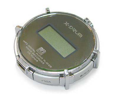 音乐鼓十分注重对称美,机身上分别有6个金属材料小隔栏,小隔栏将机身分成了大小均匀的6块,分别放置6个按键。整体做工极为精细,总的外形很像秒表,再搭配水蓝色的屏幕和巨大的字体,显示出它与从不同。产品正反两面均采用银色镜面,看上去显得典雅大方,X-DRUM的激光标志在上面也显得光彩熠熠,不易磨损纳米镜面设计有个大缺陷,就是机身容易留下指印而且不易清除,幸好产品中附送的一块丝绸巧妙的解决了问题。除了配备常规的MP3功能和移动存储功能外,还具有录音、32频道FM收音、FM内录的功能,并具有音频直录功能。其接口采用独特的All in NO设计,所有的接口都一体化,大大的减少了复杂的设置。