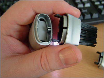 这个USB吸尘器前端是可以互换的,附件中提供了两个喷口。其中一个口径比较大,可以吸取一些体积较大的杂物。另一个则是由毛刷和三个比较小的吸口组成,方便边刷边吸收键盘中的灰尘。