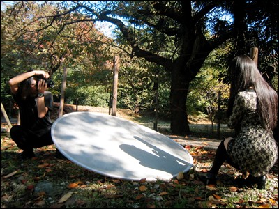 此次拍摄的外景在一个明朗的晴天,EOS 20D的设定为,色彩空间:AdobeRGB,锐度:LOW、反差:LOW。不过色彩空间设定为AdobeRGB带来了一些小麻烦,在相机的液晶屏上显示的照片颜色与电脑上显示时非常不一样,而且实际照片会比液晶屏上显示的要欠曝光一些,不过这些问题都可以在后期用Photoshop解决。