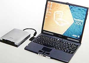 ACER TravelMate 350的光驱等配件采用全外置的设计,所以ACER TravelMate 350的机身厚度仅仅为21mm。所以ACER TravelMate 350载2002年初算是很轻薄的机型。