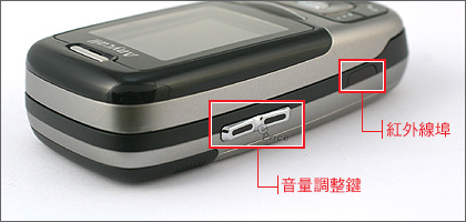 E638 的机身左侧维持了韩系手机特点,设有音量大小键,通话时可随环境背景的嘈杂度来做通话音量的调整。其下方为红外线接口,可与其它具红外线功能之信息产品做连接。