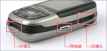 E638 的机身右侧按键,最上方为耳机孔,采横拉式的设计,既可保护耳机孔又不怕软塞会弄丢。接着是照相快速键,可快速进入照相模式或是当做快门键。位于机身下方的是充电孔以及电池卡口。