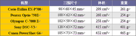 从表中反映的数据可以看出佳能G6在五款机型中体积最大、重量最重。事实最终证明在现阶段机身的体格(尤其是其重量)与成像质量成正比,这一理论在多数情况下仍然成立,为什么这样说呢?道理很简单,既然相机已经被数码化了,我们就不得不考虑电气组成对画质的影响。