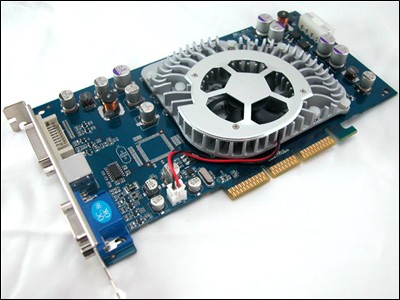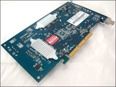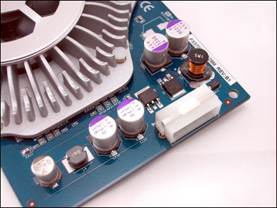 供电材料方面,均采用了OSCON电容,并配有外接电源接口。低通滤波电路同样设计相当规矩、完整,可以说PCB整体设计都相当出色。在显存方面,该款显卡采用了mBGA封装的现代2.8ns显存颗粒,正反各四枚,组成了128MB/128bit的显存规格。