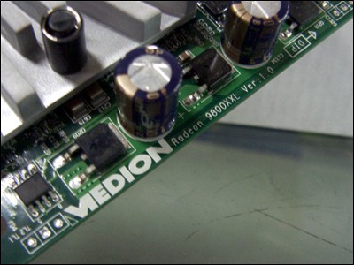 首先,从显卡的外观上看去,此款工包的Radeon9800XXL和微星的Radeon9800Pro几乎是一样的。相同的板型设计,一样硕大的散热风扇(据说散热片材质是选用陶瓷和金属混合而成的)。在显卡的正面边缘,我们看到了标有“MEDION Radeon 9800XXL”的字样。这个“MEDION”是个啥?相信知道的人还不是很多。据商家介绍,“MEDION”是欧洲的一家知名IT品牌,有不少的板卡大厂都曾与其合作过。此外,在显卡的背面还标着“MODEL 8956”的字样,这和微星的命名方式很像。综合一切迹象来看,它有99%的可能是微星给代工的。