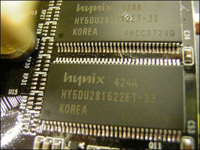 极光FX5700增强版采用非公版设计,显卡正面板载了八颗3.3ns规格的现代显存颗粒,编号为HY5DU281622ET,采用TSOP封装,提供了128MB 128bit的双128规格。充分满足了FX5700V核心600MHz显存频率的需要。