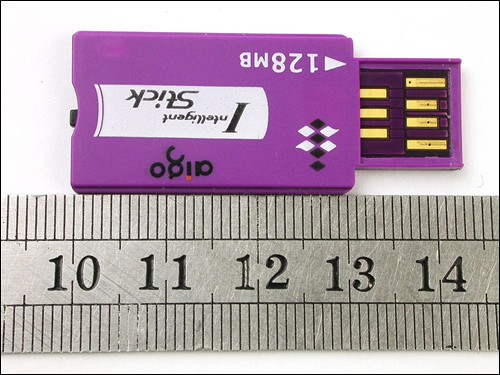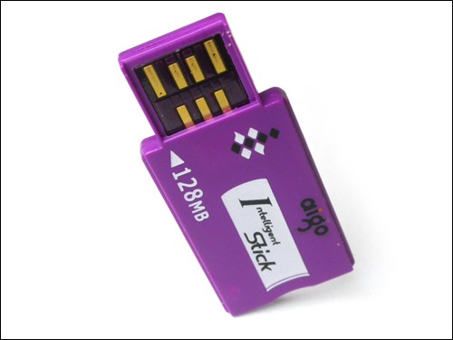 这是一款由PQI代工的产品,我们对它的第一印象??小。的确,如果单单放在面前,无论如何我们也想不到它是一个闪盘。盘体采用了醒目的紫色作为主色调,除去印在其上的厂牌外,表面并无过多修饰,也代表了简约化设计的一个方向。同时为了将体积压缩到最小,盘体部分摒弃了传统闪盘上厚重、臃肿的外壳,而是在IC模块外直接套上了一层薄薄的塑料外衣,基本沿IC轮廓所设计,以求尽量将产品做到最小化。