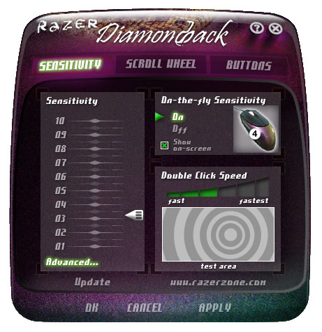 Razer的驱动程序更展现出了一种足够另类的风情。Diamondback驱动设计的相当全面,也很到位。不规则的界面设计更体现这款产品的与众不同。简单的配色方案使它看上去相当Cool。