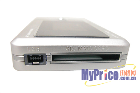 机身右侧设计有USB接口/电源接口和SD/MMC卡扩展接口。SD/MMC卡的设置是本产品的一大亮点,P20可以通过它扩展容量。