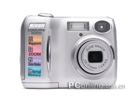 尼康3200是广受市场欢迎的3100的升级机型,象素依然为320万象素,存储介质改为sd卡。这款最新的机型的定位不但是首次购买数码相机的消费者,而且还定位那些追求舒适的手感以及简单的操作的有经验的用户。这款机型的机身设计都非常紧凑轻巧,配合相机带拿在手上非常顺手。通过明亮的1.6英寸LCD显示屏,用户可以非常清晰地实时拍摄的图像。一向在尼康高端机型中备受好评的BSS拍摄模式也出现在在这款机型中。另外,它的场景模式增加到了15种,即使是刚刚入门的初级用户,只要选择相应的拍摄模式就可以拍摄出精致的照片了。这款机型内置了14.5MB的存储器,用户即使没有SD存储卡也可以立刻进行拍摄。此外,640×480/15fps无限时有声拍摄的视频拍摄、4cm的微距功能也足以满足用户在此方面的要求。