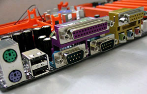 板载了RealTek的ALC650 Codec芯片,支持5.1声道的模拟音频输出。因为南桥采用了82801EB ICH5的芯片,没有带R-磁盘阵列功能。不过这个功能对于我们普通消费者是奢侈的。板的后接口非常传统,PS/2口,一个LPT接口,两个COM口,两个USB2.0接口,1个MIDI/游戏接口和六声道输出端口布局和颜色完全符合PC2002规范,显示出良好的兼容性。