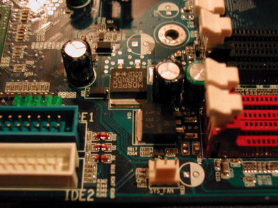 此款主板的做工采用了升技的一惯作风,采用四相回路的稳压电路,在有效降低系统运行温度的同时,也为系统的稳定性打下了坚实的基础。橘红色PCB大板,在整体上给人一种大气感觉,IDE接口采用的是横向设计,插拔都非常的方便,只是北桥散热片和AGP插槽相隔太近,给显卡的安装带来些许不便。