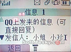 作者开通了手机绑定功能网上好友可以直接在聊天面板中点击作者的头像发送手机短信,作者的手机则会接收到QQ信息,而接收的信息则会显示在手机上的“QQ信箱”(图2)中,如果开通了腾讯移动QQ的包月服务,还可以直接用手机回复QQ信息,网上好友的信息提示会显示一个手机符号,表示该消息是从手机上发来的。