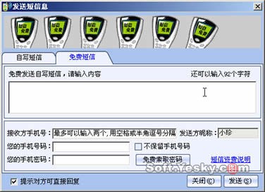 其它的几个国产即时通讯软件也都具有发送手机短信息的功能,有的还可以免费发送限制条数内的短信,如新浪UC用户可以每月免费发送450条短信息(每天免费15条)(图4).