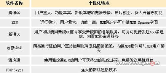 总的说来各个软件在主要的还是重视聊天功能,然后再考虑增加一些有特色的附属功能,它们之间的差距在于某个服务的突出卖点,如前面所讲的利用雅虎通发送手机短信全部免费,这就是它最大的卖点。由此作者也总结了一下每个软件的突出特点。