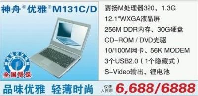 神舟优雅M131C/D,采用赛扬M1.3GHz处理器,855GME芯片组,Intel Extreme2 显卡,256MDDR内存,5400转30G硬盘,12.1寸宽屏,CDROM/8XDVD光驱,锂电池,可选配802.11b无线网卡。两个USB2.0,一个S-Video输出。全重1.9千克。此前市场上12寸宽屏的最低售价为8888元,为什么神舟能达到6x88元的价格,足足低了2000元呢?笔者经过对比发现,神舟宽屏笔记本与同规格主流产品有一个差别,神舟的液晶屏虽然为16:10,但标准分辨率为960*680,并没有达到1280*800。对此我们应该如何看待呢?笔者认为,对比现在许多名牌高端15.4寸宽屏笔记本达到的1280*800分辨率,12.1寸达到960*680并非是缺陷和不足,这样可以使字体不至于太小。许多12.1寸笔记本为了解决字体过小容易产生视觉疲劳的问题,在屏幕上采用高亮高对比度等多种技术,使整机成本?增。只要神舟能保证屏幕显示的文字清晰、色彩均匀、对比度到位,采用这个分辨率从而把价格降低的做法,仍然是值得肯定并有实际意义的。毕竟,没有神舟,就不会有7000元以内的12寸宽屏。