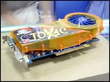 和在包装盒外看到的一样,蓝宝的这款Radeon X800Pro TOXIC实物的样子确实很夸张。这种夸张主要来自于它硕大的散热系统。毕竟这种把整个显卡都包裹的严严实实的产品,在市场里还是不多见的。散热器上所注明的“Toxic”字样,也显示了它的身份。