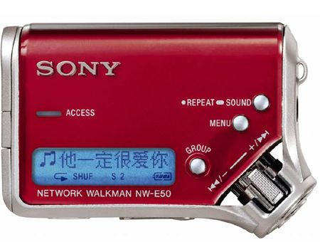 NW-E50有银色、蓝色和红色。配送的是SONY MDR-E838耳机。其采用双色背光液晶显示屏幕,进入群组模式时会以绿色背光显示,而在单曲操作及播放模式时则会以蓝色背光显示。