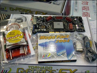 “宝贵”的Inno3D FX5900XT限量版乍看上去好像缺了点什么。与别的显卡相比他的风扇被拿掉了,赤裸的显示芯片暴露在外。本以为它不用散热器呢,老板忙说我们有给它配更恨的散热器。就是下边看到的这个CoolerMaster硕大的热管散热器。