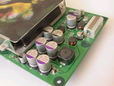 绿色的底板上覆盖这一快硕大的散热片,看起来非常具有分量!由于散热片太大,所以卡的背面增加了手拧螺丝,更加牢固的锁定住了散热片。另外它在电容的耐压级别得到了升级,这些改变都是为了能够更加好的超频打下基础。