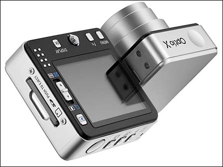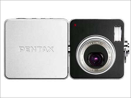 我们首先推荐的是宾得OPTIO X,它是刚上市的最新产品,很多地方都还没有正式发售,这款机器不但设计精美、做工精湛,而且外型非常独特,它的机身采用了两段式的设计,镜头和机身是分开的,因此镜头可以作最大270°的随意旋转。造型方面,它有点类似于尼康早期的COOL PIX995,镜头部分可以向上旋转180°、向下旋转90°。除了镜头独特之外,宾得OPTIO X还具有非常小巧轻薄的体积,其机身厚度仅仅是18毫米,是目前宾得OPTIO系列相机之最,而且机身采用铝合金外壳,坚固耐用,再加上简洁的银色和黑色搭配,简直就是一件精致的艺术品,既时尚独特又简洁大方。