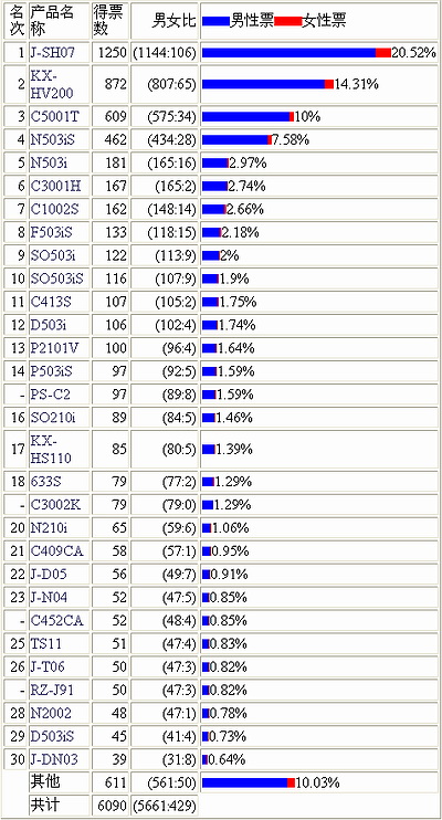 2001年总投票数是6090票,其中第一名是夏普制造的可以支持电子邮件的J-SH07。
