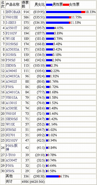2003年总投票数是4986票,第一名三洋电机制造的以外形设计著称的INFOBAR,以300多票的优势领先于第二名。第二名是同样强大的夏普V601SH。