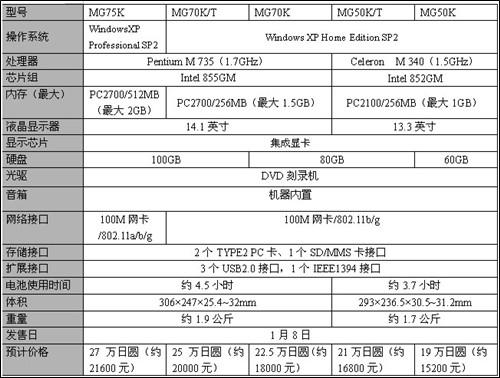 比较重视携带性的2轴笔记本MG系列也一次发表了5个型号,其中高端机器的MG75/70所使用的显示器略大于低端型号的MG50的显示器。装备了14.1英寸显示器的MG75K/70K统一使用的是移动奔腾四735的CPU,其中MG75K和MG70K/T还装备了100GB的大容量硬盘。