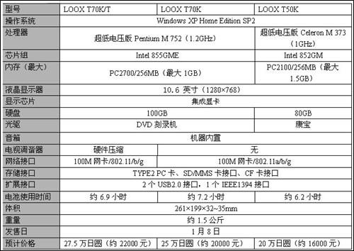 配置方面,全系列为10.6英寸宽屏,T70K装备了超低电压版的奔腾M处理器,而T50K装备了超低电压版的赛扬M处理器,不过时钟频率比以前的型号都有所提高,电池也因此在使用时间上稍微的损失了一点。下表为LOOX T系列新机器的配置对比。