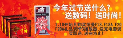 纽曼数码礼品装自12月发售以来,因其包装设计精美、吉祥喜庆,成为广大消费者新年礼品的理想选择。1月10日起,纽曼公司推出“买数码礼品装赠送充电套装”的促销活动。凡购买纽曼之音F20、F20A、F18、F18A MP3礼品装的消费者,均可获赠价值38元的劲霸充电器套装一套(MP3专用,内含充电器一个、600mAh两节)。活动期间,纽曼之音F20 MP3 128M仅售:358元;纽曼之音F20A MP3 128M仅售:398元;纽曼之音F18 MP3 128M仅售:298元;纽曼之音F18A MP3 128M 仅售498元。