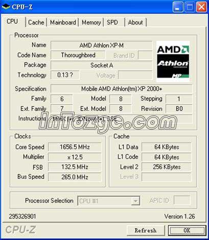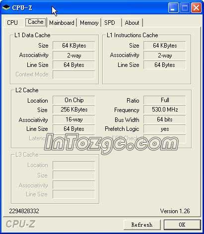 在刚刚打开CPU-Z的时候,软件反映的是CPU最高频率,1.66GHz(1656.5MHz),133MHz外频,12.5倍频,128KB L1 CACHE,256KB L2 CACHE。