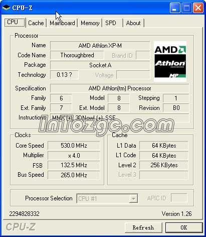 不过,几秒钟以后,由于当时CPU基本处于空闲状态,自动降频为530MHz,外频没有改变,倍频降至4倍。这说明Athlon XP-m的节能型还是不错的。
