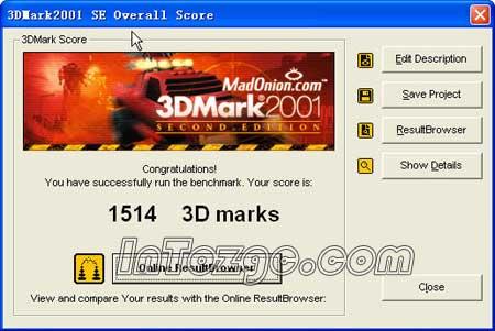 因为是AMD笔记本,采用整合显卡,而且本上没有任何ATI标志,所以开始小编想当然的认为它会采用VIA KN400芯片组,并认为3D Mark2001SE得分不会超过1000。最终的结果却令人比较吃惊,达到了1514分(32MB共享显存)!这时才真正想到这款笔记本的主板芯片组,原来为ATi IGP320M,其整合显示芯片效能相当于ATi Radeon7000。