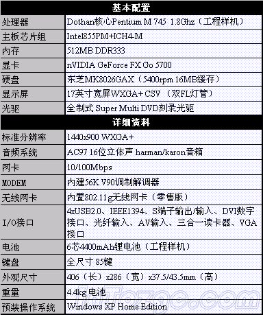 东芝本次送测的G10是一台工程样机,因此在机器配置与零售版本并不相同,随机附件也不完整。这台G10的处理器采用了Dothan核心的Pentium M 1.8GHz,与零售的2GHz有所不同,并且没有配备无线网卡。送测工程样机的详细配置请见下表。