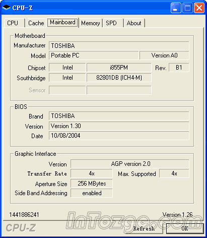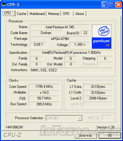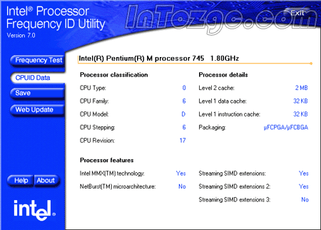 Intel Processor Frequency ID Utility和CPU—Z中正确的识别出了G10所使用的Dothan核心Pentium-M 745处理器,并检测出该处理器的二级缓存为2MB。