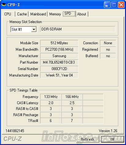 内存则为三星生产的PC2700(166Mhz)DDR,容量512MB,生产日期为04年第51周。