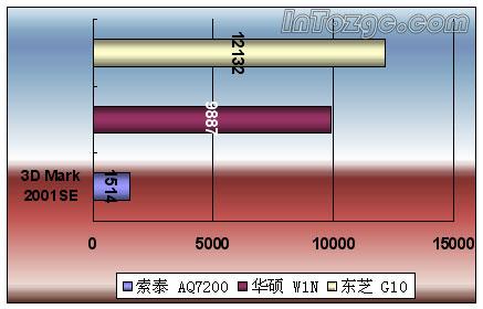这三款笔记本分别采用了整合显卡、N卡以及A卡,索泰AQ7200AC整合显卡仅相当于Radeon VE,显存带宽也明显不足,所以成绩不好也在情理之中,至少它会比VIA整合芯片组的显示性能强上很多;W1N的9700-m是目前的流行的高性能笔记本独立显卡,其3D Mark得分即便与主流台式机系统相比也不遑多让。很久以来,我们一直想知道nVIDIA与ATi在移动GPU方面孰强孰弱,只是很难见到采用N卡的本机,Qosmio G10则提供了良好的机会。不只是3D Mark01得分破万,3D Mark03也遥遥领先,至少在测试方面,5700 Go旗开得胜。