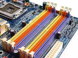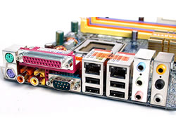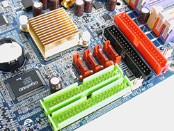 主板上有6个DIMM,其中红色和蓝色插槽是用来支持DDR400,另外的两个黄色插槽是用来支持DDR2-533的,支持双通道功能,但是两种内存不能同时使用。IEEE 1394b 芯片可以支持未来的Firewire(火线)800技术,Texas Instruments TSB81BA3/TSB82AA2芯片提供多达三个IEEE1394b接口,USB 2.0以及IEEE 1394b接口位于主板的边缘处。