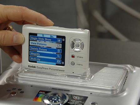 除此之外Kodak还展示了EasyShare Picture Viewer掌上图片浏览器,搭载2英寸20.1万象素液晶显示屏,内置的32MB内存,支持SD/MMC卡,可以直接播放存储卡中的图片,还支持EasyShare dock系列打印机,可以直接将图片输出到PictBridge打印机。