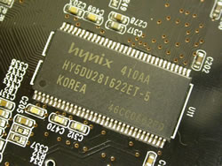 显卡的正反两面总共有8颗现代的5ns显存芯片,每片都是16兆16位8片加在一起刚好128兆128位,显卡默认显存核心频率为275/550,用来应付WAR3和CS等游戏是绝对没有问题的。
