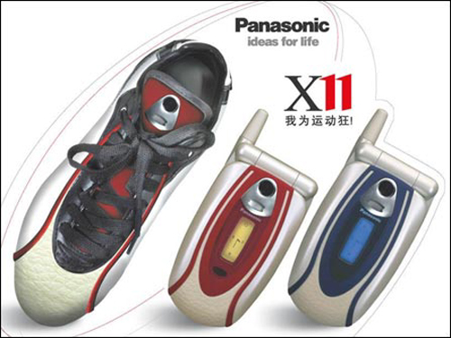 为了迎合广大铁杆足球迷,松下推出了一款像极足球鞋的运动手机x11,从外形上看,X11还真是有点足球鞋的味道。手机翻盖最下方采用了真皮做为装饰,这就好似球鞋的前部,而翻盖处整体配有曲线的设计,看上去就好似球鞋与系带处的隔断,中间部份像鞋舌头。虽然x11外形上非常有个性,但它也是一款很有内涵的手机。采用双屏折叠设计,外屏是96×68像素的七色背景灯,内屏是6万色132×176 分辨率的tft真彩屏幕,秉承松下手机一贯风格,颜色鲜艳,画面细腻。采用了听筒与扬声器分离的设计,九宫格运动菜单加上动感音乐,让用户时时感受运动真谛。