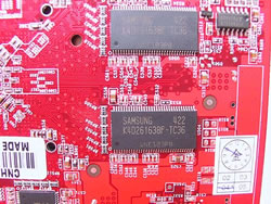 散热器周围整齐的排列着4颗显存芯片,翻开背面还有4颗,一共8颗显存芯片,细看一下,采用的是三星3.6ns的芯片,每片16M16位加在一起刚好128M128BIT,值得注意的是一般的5700标准版显卡采用的都是4ns的显存芯片,也就是说这款卡采用了3.6ns的芯片表示出其具有更好的超频潜力。根据测试这块卡的显存频率可以稳定在650左右,提升幅度确实非常大。