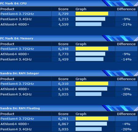 成绩表明在接近4G时,P4 CPU的性能在很多情况下已经超过了Athlon64 4000+