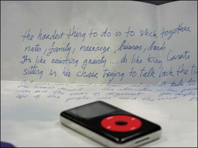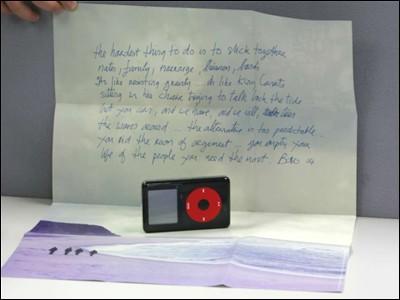 除了上面提起的在iPod背面有乐队四位的签名,U2还为粉丝们准备了另外一份大礼——BONO写给各位的亲笔信。装签名信的包装盒是全黑的,当我打开它的时候,发现在开口处用红色的字写着Enjoy,当时就有一点点兴奋,知道这里面装的应该就是签名信(在买iPod U2 之前已经看过香港那边的PP,所以知道有签名信)。实在佩服苹果公司在细节方面的处理,一个小小的“Enjoy”的确让人对于这个黑盒子有了不一样的感觉。