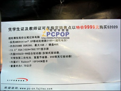 富士通S2020是富士通去年初推出的一款13英寸XGA屏幕、采用AMD处理器的机型,隶属于富士通高端商务机型。早先,这款笔记本一直高据着10888元的售价。现在我们得到消息:富士通S2020特价9999元,又有了将近九百元的降幅。