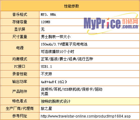 机身采用150mAh/3.7V高性能锂离子充电电池,为使用者提供长达3年的超长使用寿命;附件中配置有专门的充电器,也可以通过USB接口直接充电,非常方便。电池充满后,可支持9小时以上连续播放,对于一款手表式MP3来说,这个待机时间已经很令人满意了。