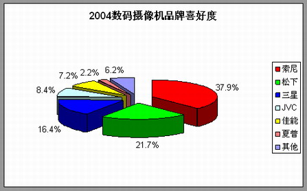 作为消费类数码产品领域的龙头,索尼在数码摄像机市场上无论是销量还是用户关注程度都领先于其他品牌,从“2004数码摄像机品牌喜好度”图表中可以看到,索尼、松下、三星、JVC和佳能这5大品牌占据DV市场90%以上的分量,而索尼更是以37.9%的比例占据头把交椅。显然,在消费类数码摄像机市场高度品牌集中的现象依然十分明显,索尼和松下两大品牌最具市场号召力和人气指数,其比例接近60%。令人稍感意外的是佳能居然排到了三星和JVC之后,也许正是三星的廉价策略和JVC的创新意识“击败”了佳能。虽然佳能是专业影像领域的执牛耳者,但其开拓消费类产品市场的能力似乎不如三星、JVC,更别提精于市场的索尼了,佳能在消费类数码相机市场也有同样的现象。