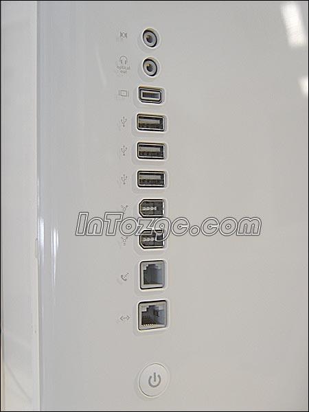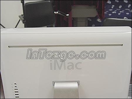 虽然是一体机,但扩展性必不可少,iMAC G5的接口自然要被放在背部,从上至下分别为音频输入、音频输出、视频输出、3xUSB2.0、2xIEEE1394、Modem、LAN,在它们下面,就是电源按钮了。