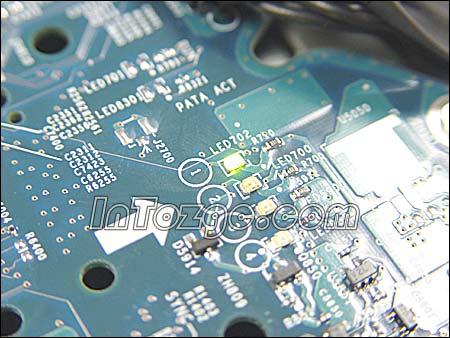 带着疑问,以极大的信心和勇气,在开盖情况下接上了电源,发现主板上一个绿色的LED灯亮了,这表示电脑已经通电。